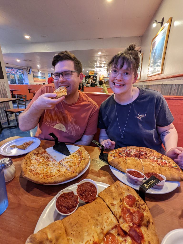 Our first stop after settling in was of course to eat. Dough Boy’s Pizza was voted best pizza in VB. It first opened its doors in 1989 and has three locations in Virginia Beach along Atlantic Avenue. We dined at the 2410 Atlantic Avenue location; it was about a 15 minute walk from the Airbnb. Their most famous type of pizza is called “The Wave” which is half calzone and half pizza. Half of it is folded over and looks like a wave, hence the name. I ordered the Classic Wave, Kim got the Pipeline Wave, and Phil ordered a cheese pizza. We also ordered Cherry Lime Crush cocktails which were amazing – strong Sonic Cherry Limeade vibes.