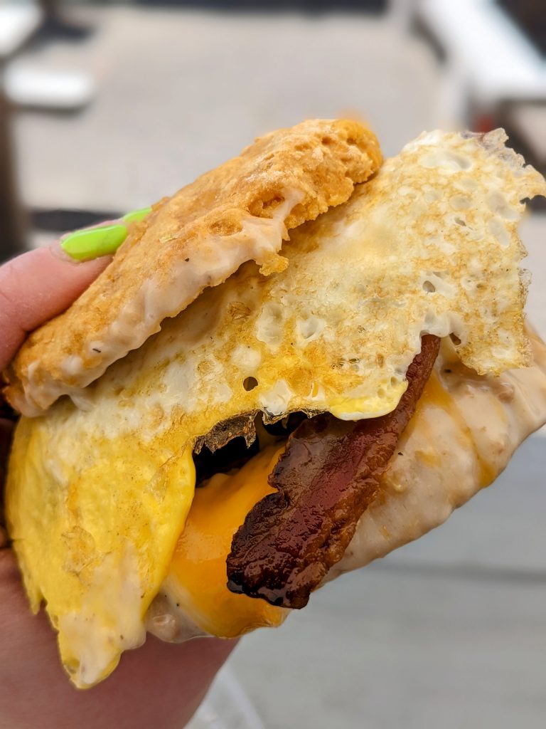 On our way home, we made a pit-stop in Norfolk to try the famous Handsome Biscuit, which is just 30 minutes outside of Virginia Beach. They specialize in making made from scratch sweet potato biscuits, which none of us had tried before. Their most popular biscuit is the Hella Fitzgerald – a sweet potato biscuit sandwich with fried chicken with bacon, cheddar, and red eye pork sausage gravy. I ordered it and added a fried egg. Everything we tried there was incredible, and the staff was so friendly and inviting.